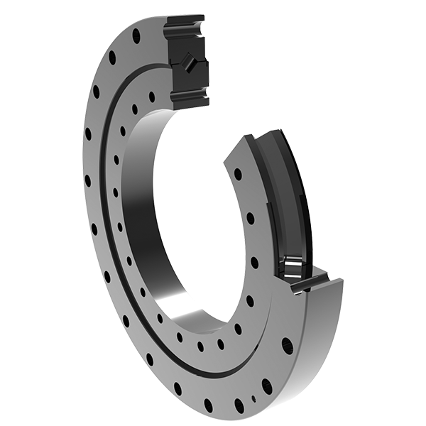 交叉圆锥滚子轴承由外圈、内圈、圆锥滚子(带有支承垫片)、隔离块组成。圆锥滚子在相匹配角度的V型滚道间交叉排列。可以承受两个方向的轴向力、径向力、倾覆力矩和其它联合载荷。外圈或者内圈具有分离型配置,并可配有可调节预负载大小的调整垫圈,可根据安装需要进行预载荷调整。滚道和滚子的优化接触形状,提供了高的旋转精度、高的运转稳定性和更大的倾斜刚度。与交叉圆柱滚子轴承相比,具有更高的工作转速。